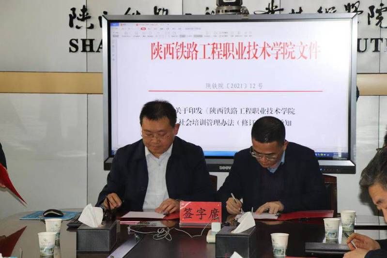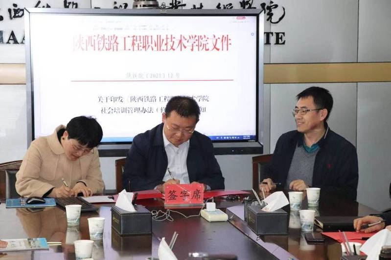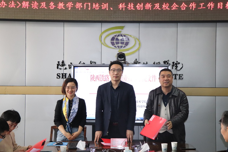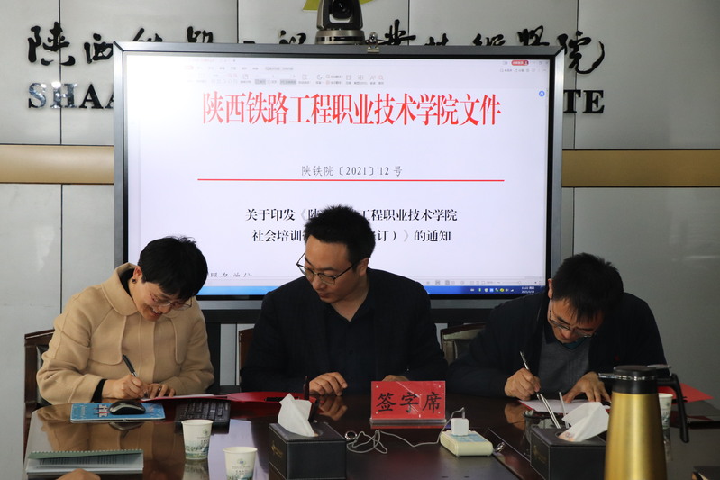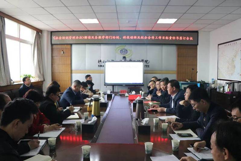 3月18日下午,学校在临渭校区11楼会议室召开《社会培训管理办法》解读及各教学部门培训、科技创新及校企合作工作目标责任书签订会。旨在推进学校“双高”建设和“提质培优”行动计划中社会服务相关方面的工作,贯彻落实校长焦胜军在开学职工大会上的讲话精神,进一步明确社会服务工作年度建设任务,打造陕铁院社会服务品牌,全面提升学校社会服务方面能力。校长焦胜军,副校长张学钢、祝和意和各教学院长参加了会议,会议由副校长张学钢主持。