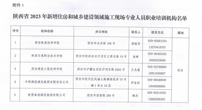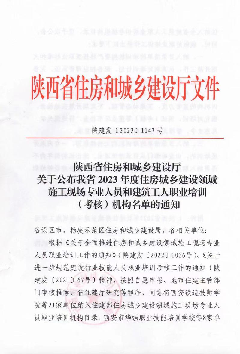9月13日,陕西省住房和城乡建设厅发布了《关于公布我省2023年度住房城乡建设领域施工现场专业人员和建筑工人职业培训(考核)机构名单的通知》(陕建发〔2023〕1147号),我校新增为陕西省2023年住房和城乡建设领域施工现场专业人员职业培训机构。